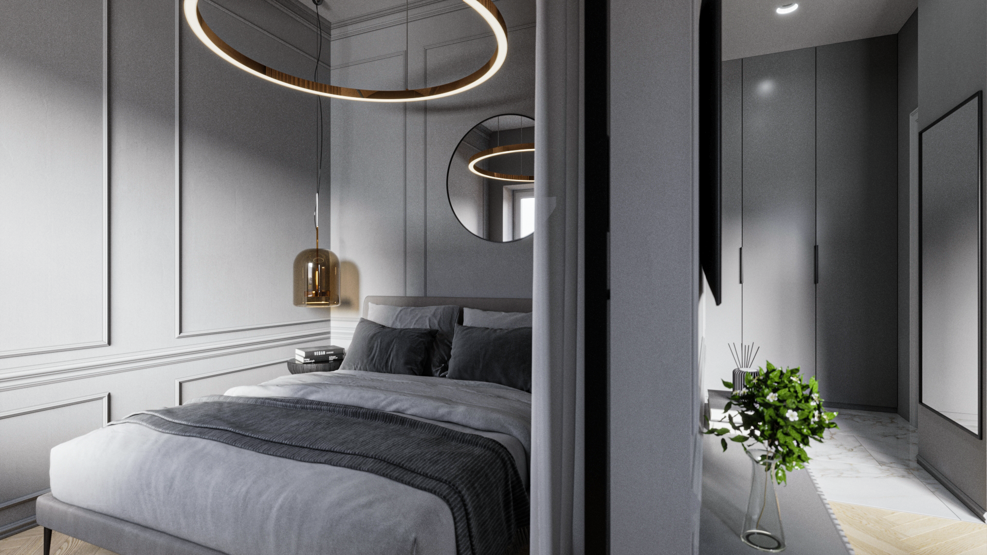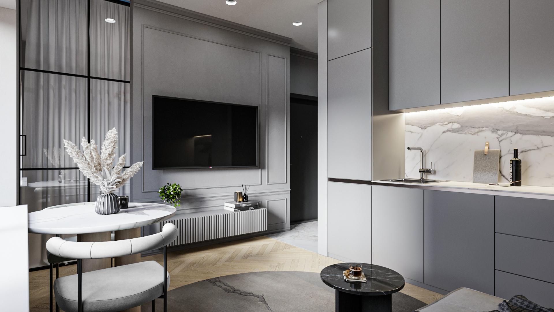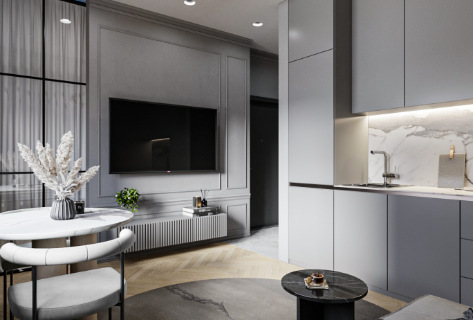 Puošnumas ir elegancija derinama su moderniomis detalėmis ir taip kuriamas didesnės bei vizualiai neapkrautos erdvės pojūtis. Klasikiniai elementai, tokie kaip lipdiniai ar bagetai, subtiliai pritaikomi kuriant patogų funkcionalumą. Tai puikus sprendimas puikiai suderinantis jaukumą ir šiuolaikinius akcentus.